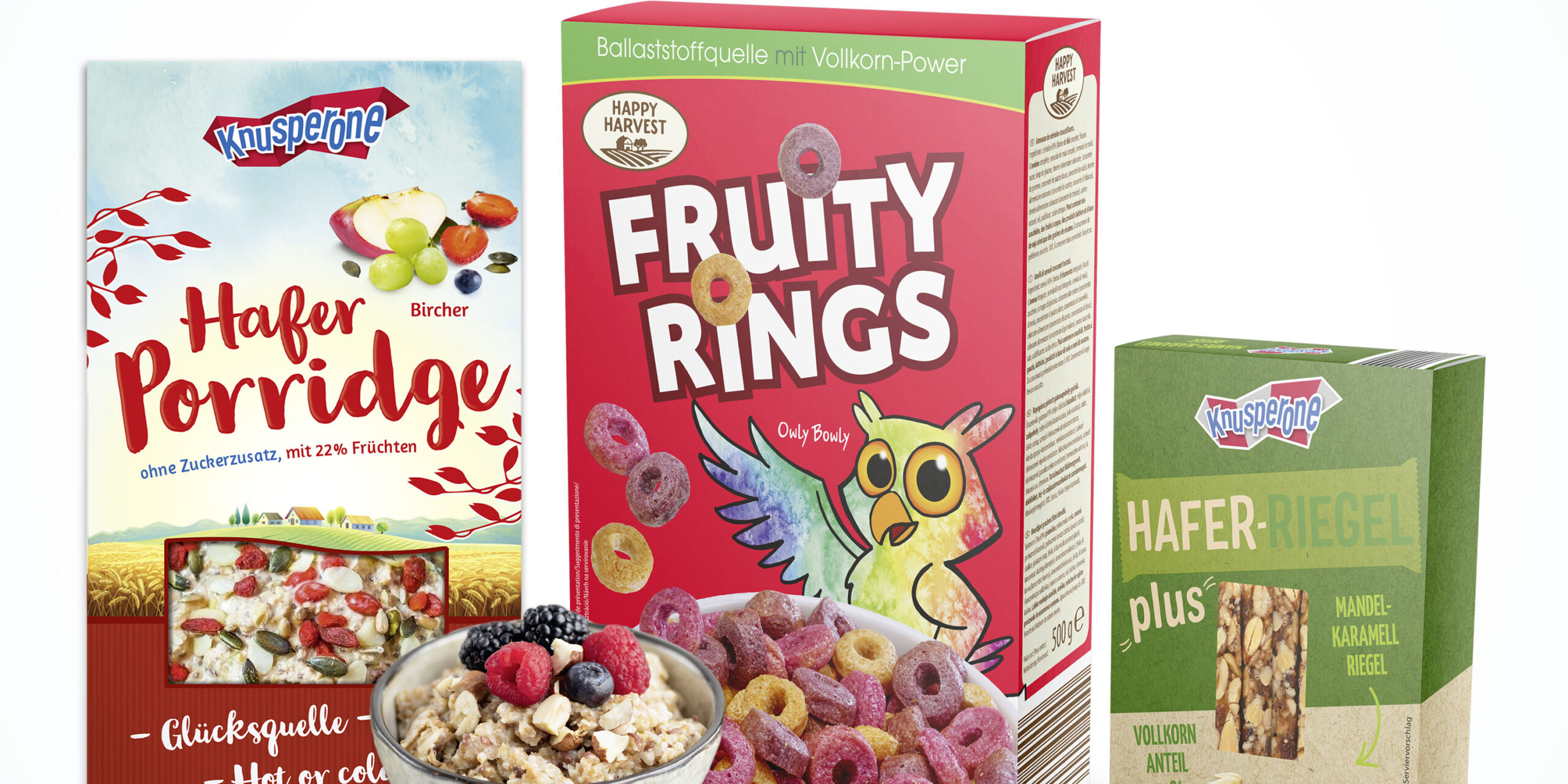 We relaunched the article Fruity Rings under the brand name ‘Happy Harvest’. The design was created specifically for the entry-level price segment. The owl was drawn by our in-house designers and is intended to appeal to a young target group.