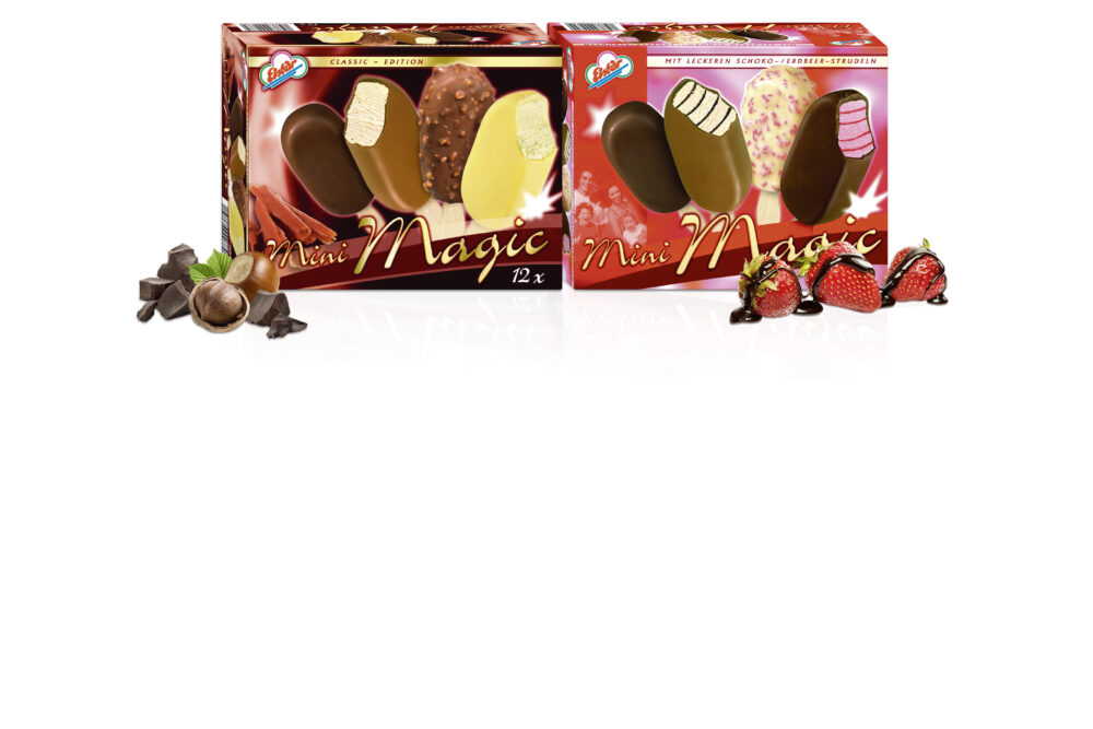 The Eisbär brand is an expert in ice cream, producing throughout Europe. The Mini Magic ice cream packaging design was supported by mouth-watering photos of product-related images to illustrate the tasty, chocolatey and fruity varieties on offer.