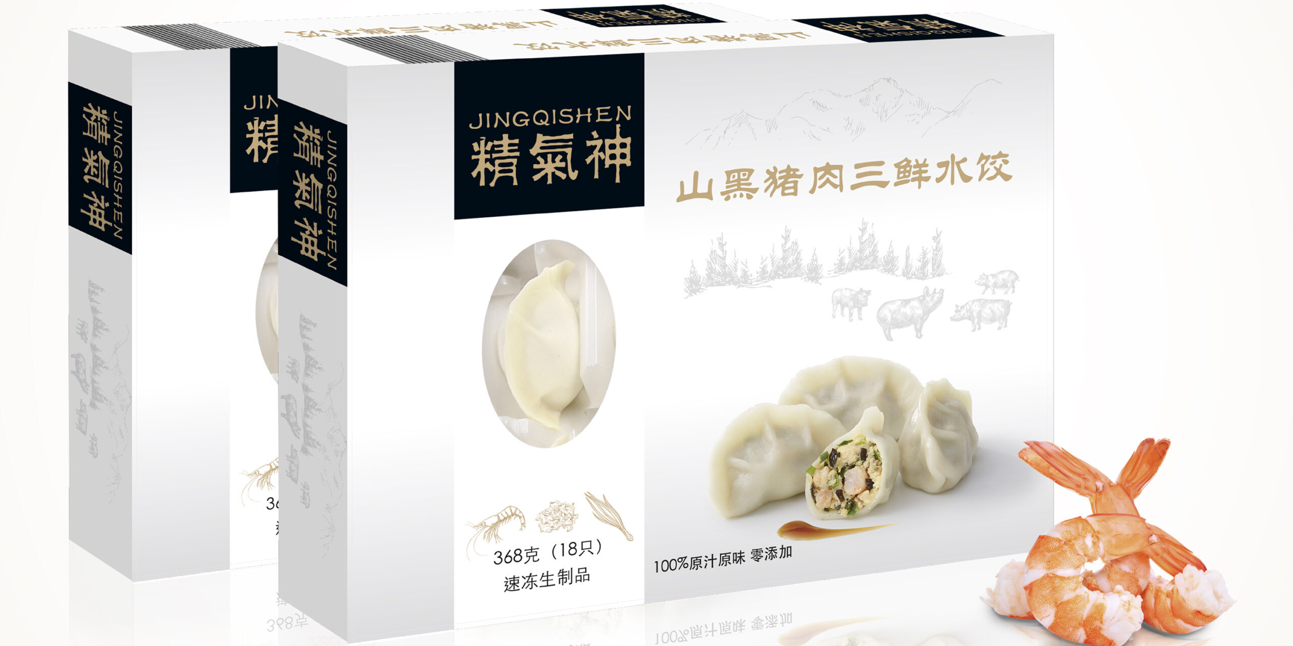 The company Jing Qi Shen is one of the largest pork producers in the world. The hand-drawn image in the background corresponds to the real landscape in which the pigs are reared and allowed to mature in a natural environment. In China, it is common for packaging to be designed to be more colourful and unusual than those around it. Our design, however, has a clean, discreet, all-white look. Our simple and elegant design conveys a uniqueness and high level of quality in the freezer compartment.