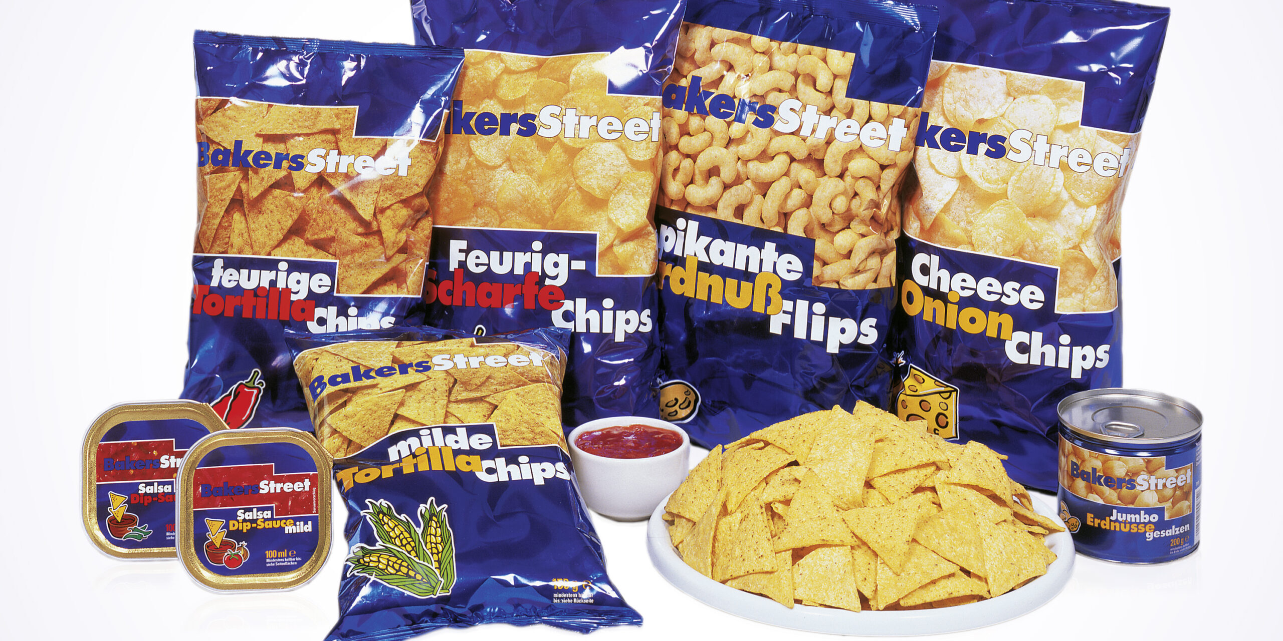 The BakersStreet brand is a mid-priced option in the snacks segment. The toned-down design uses a shade of blue throughout, which results in a strong, block formation on the shelves, thereby making it easily recognisable and allowing an easy line extension.